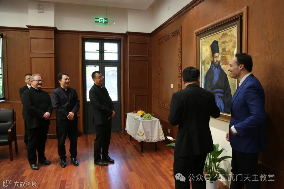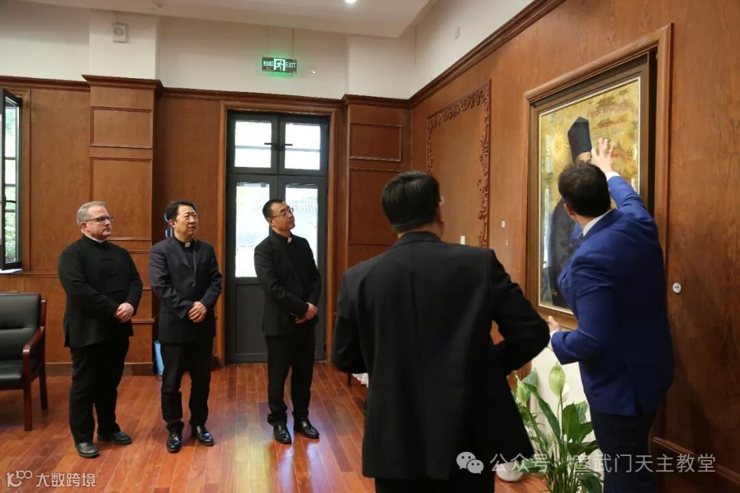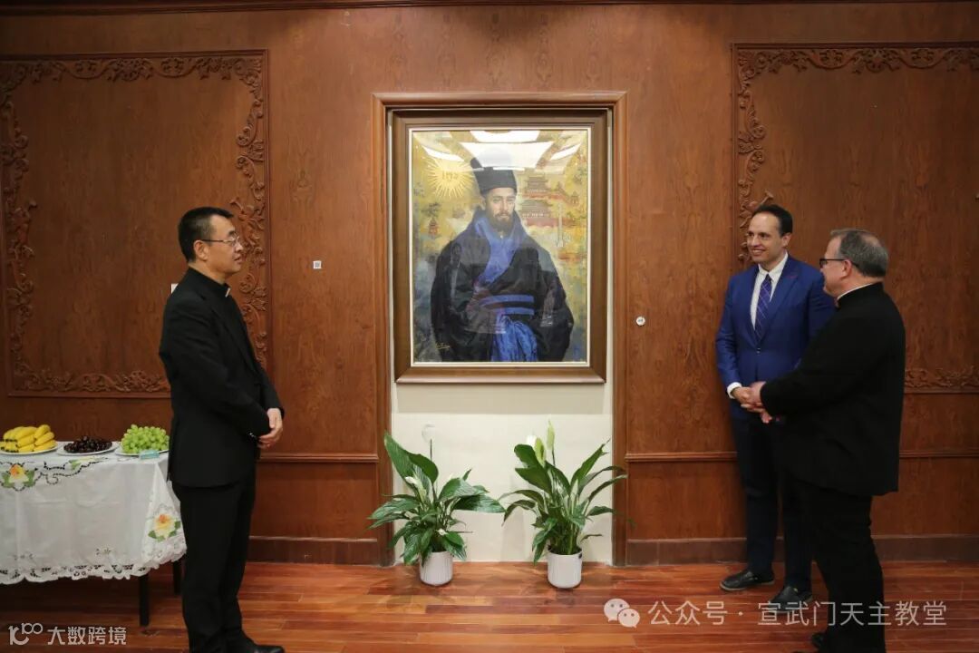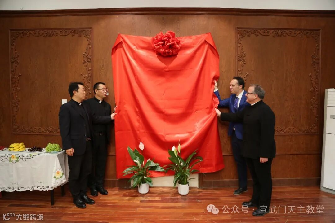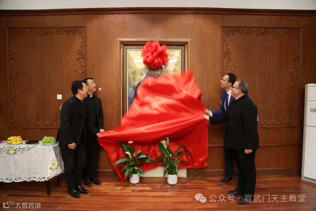 最后,甄主教和张神父、秋神父、劳尔共同揭幕劳尔作品:庞迪我画像,正式启用南堂庞迪我会议室。