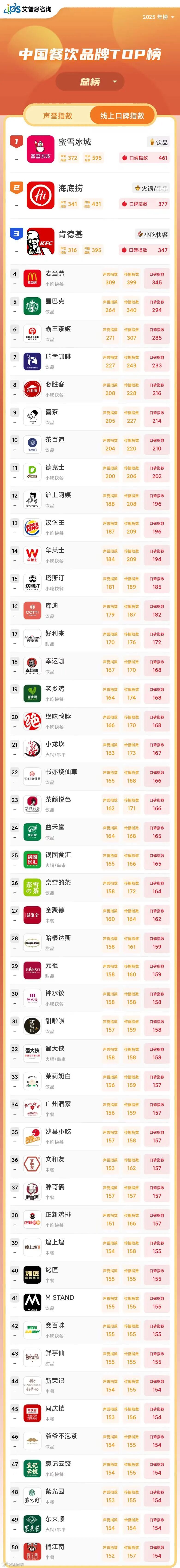 艾普思指数|年榜:2024年中国餐饮品牌线上口碑指数TOP50