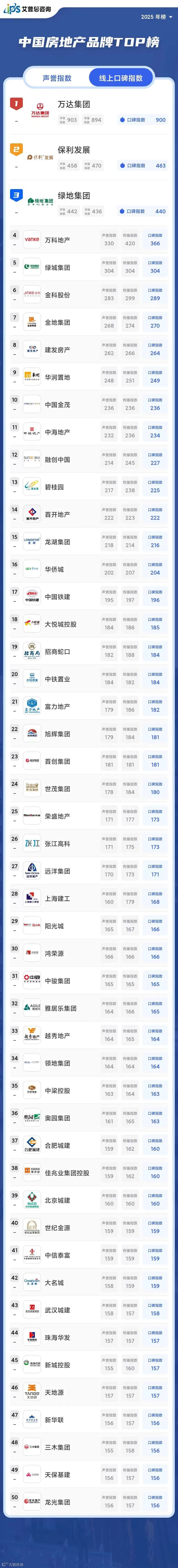 2025年线上口碑指数位列前三的房地产品牌为:万达集团(口碑指数900)、保利发展(口碑指数463)、绿地集团(口碑指数440)。