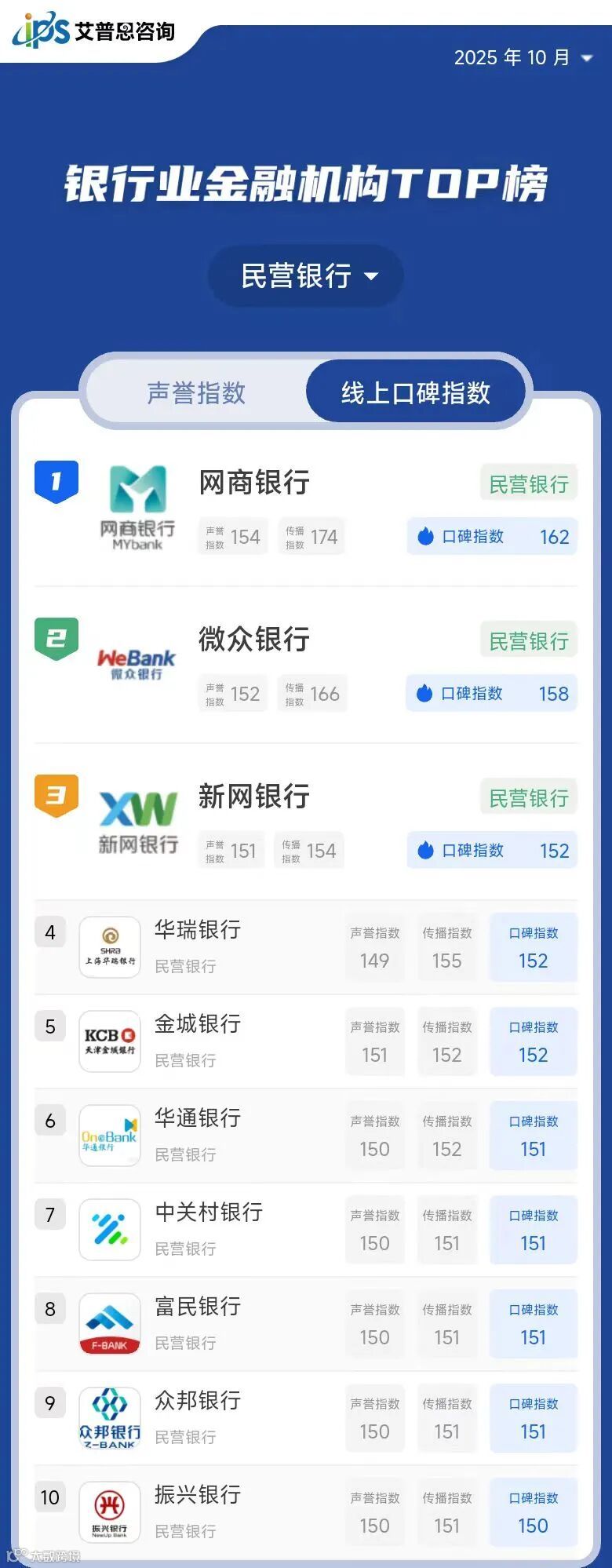 10月线上口碑指数排名前三的银行业金融机构为:工商银行(国有大型商业银行,口碑指数467,排名与上月持平)、农业银行(国有大型商业银行,口碑指数447,排名与上月持平)、中国银行(国有大型商业银行,口碑指数408,排名与上月持平)。