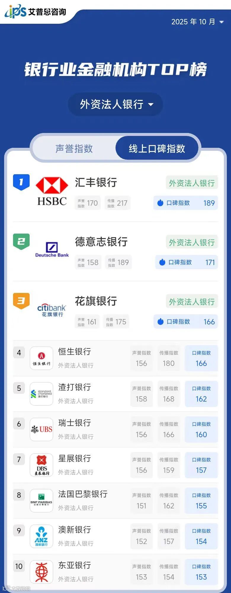 线上口碑指数排名前三的国有大型商业银行为:工商银行、农业银行、中国银行;线上口碑指数排名前三的股份制商业银行为:招商银行、兴业银行、浦发银行*;线上口碑指数排名前三的城市商业银行为:江苏银行、北京银行、上海银行;线上口碑指数排名前三的民营银行为:网商银行、微众银行、新网银行;线上口碑指数排名前三的外资法人银行为:汇丰银行、德意志银行、花旗银行。