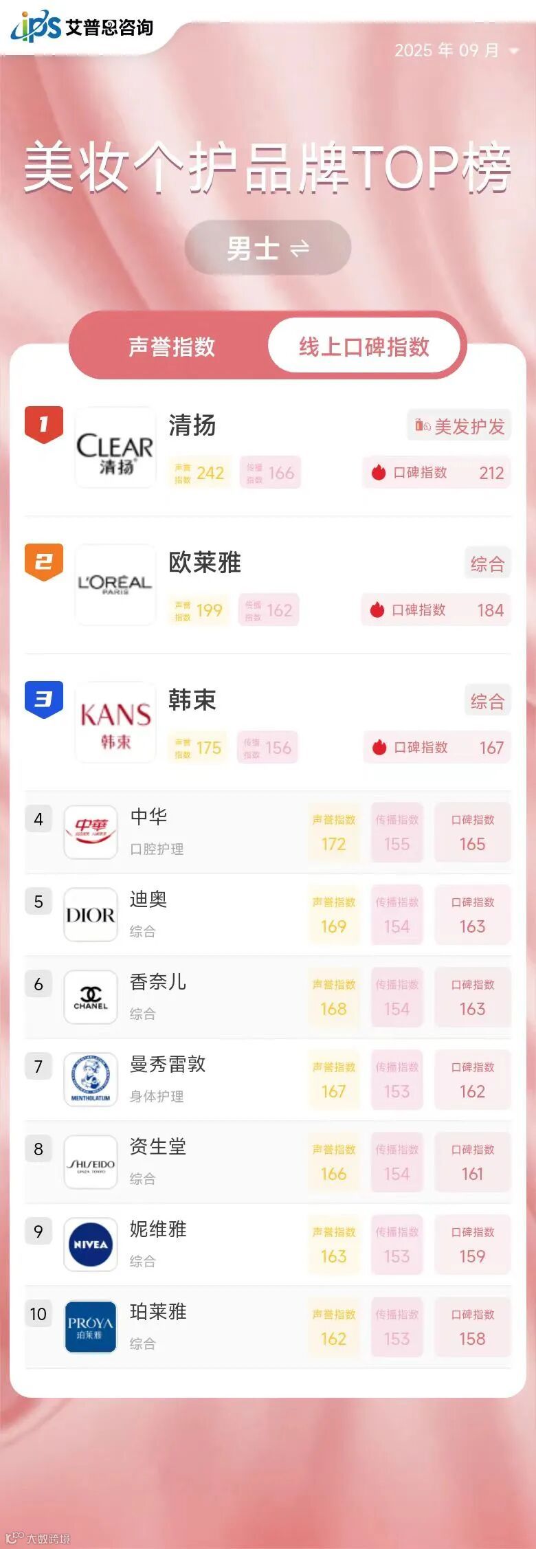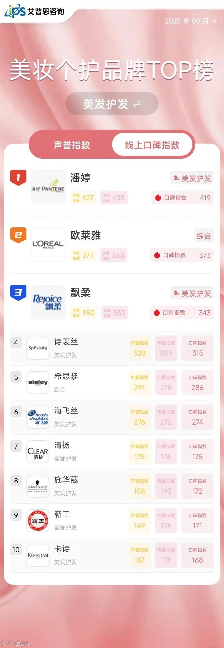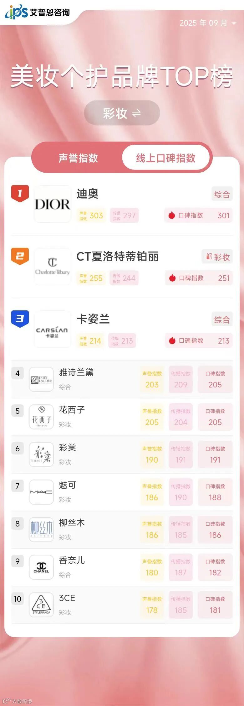 2025年9月线上口碑指数排名前三的美妆个护品牌为:迪奥(综合,口碑指数594,排名与上月持平)、欧莱雅(综合,口碑指数470,排名与上月持平)、潘婷(美发护发,口碑指数419,排名较上月上升40位)。