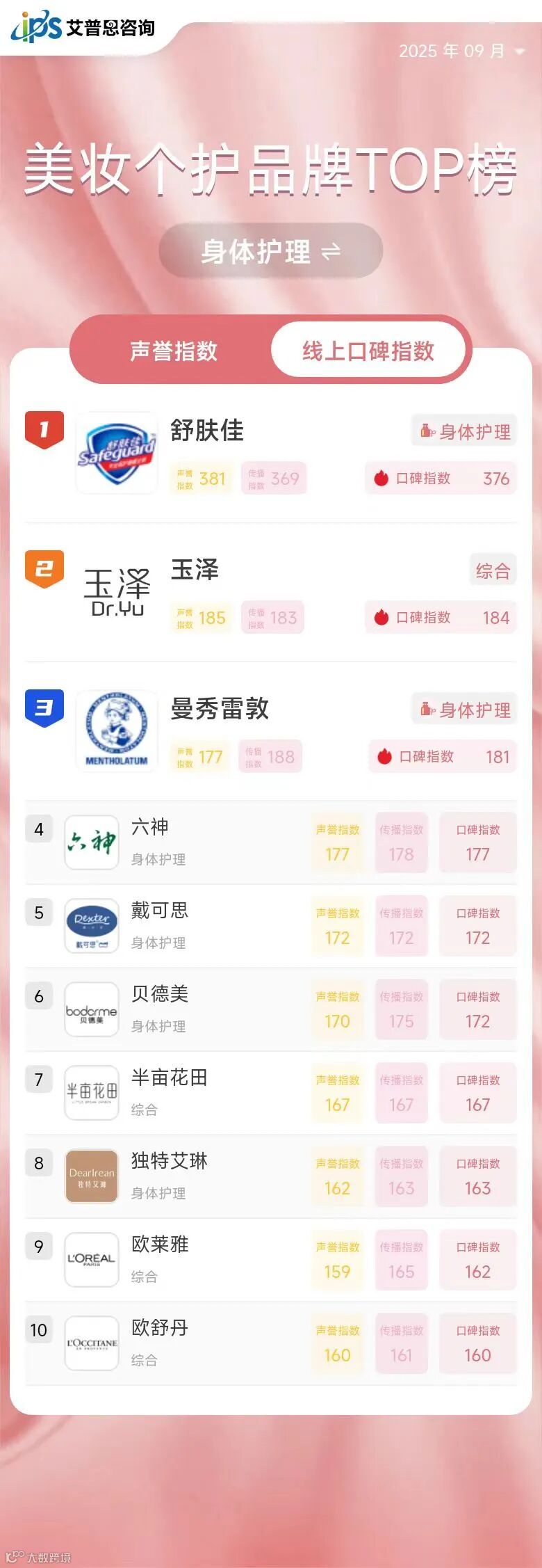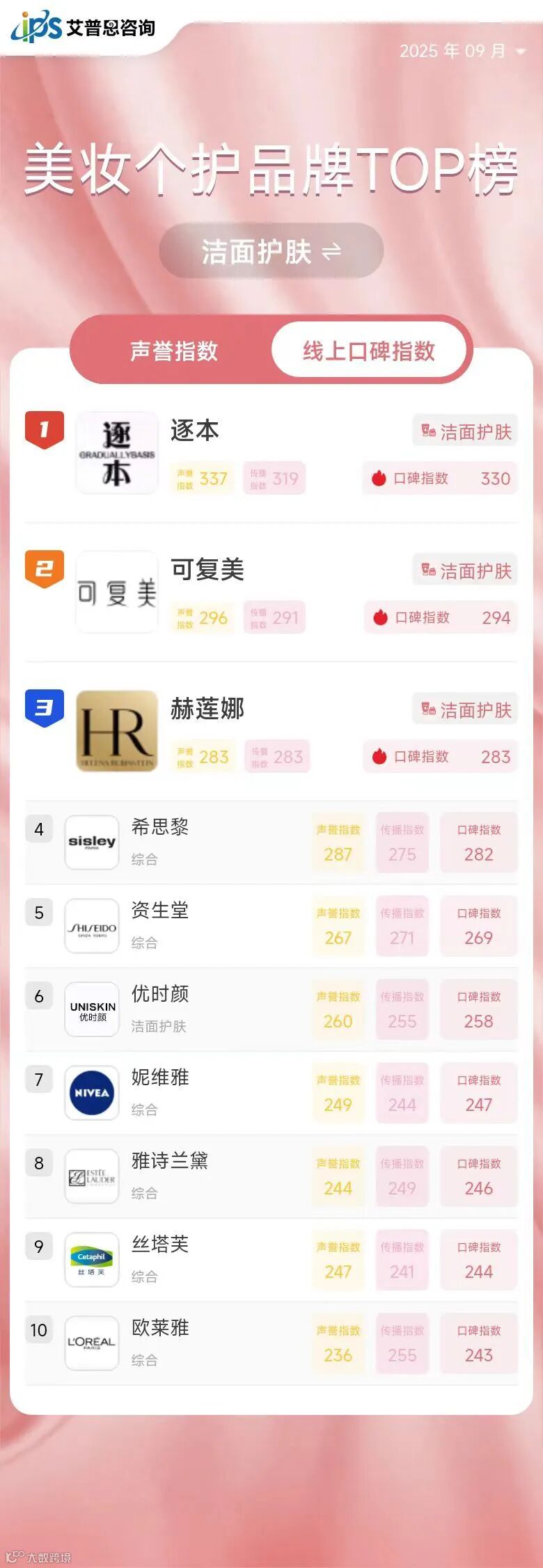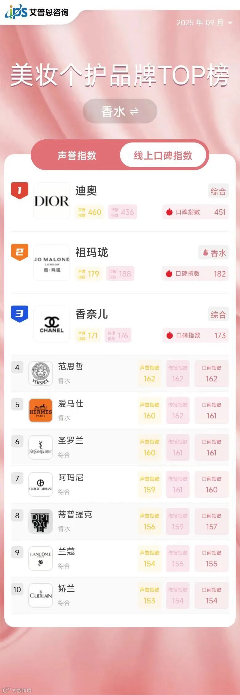 2025年9月线上口碑指数排名前三的美妆个护品牌为:迪奥(综合,口碑指数594,排名与上月持平)、欧莱雅(综合,口碑指数470,排名与上月持平)、潘婷(美发护发,口碑指数419,排名较上月上升40位)。