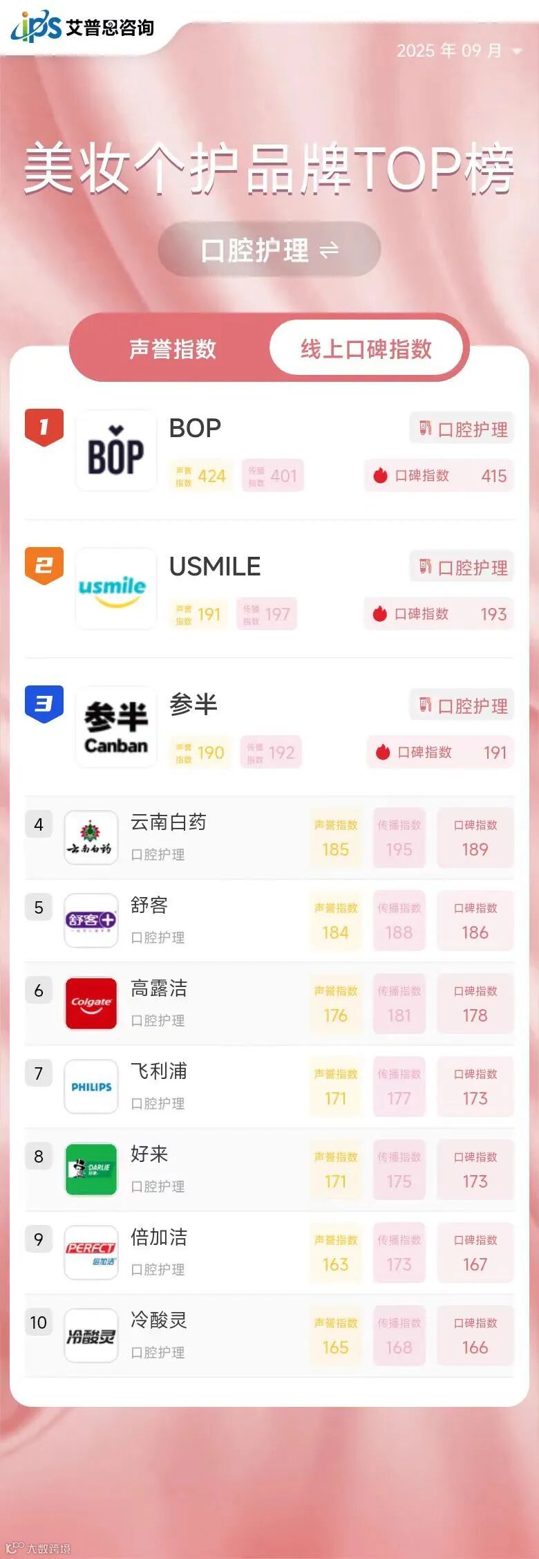 线上口碑指数排名前三的身体护理品牌为:舒肤佳、玉泽*、曼秀雷敦;线上口碑指数排名前三的口腔护理品牌为:BOP*、USMILE*、参半*;线上口碑指数排名前三的美发护发品牌为潘婷*、欧莱雅、飘柔*。
