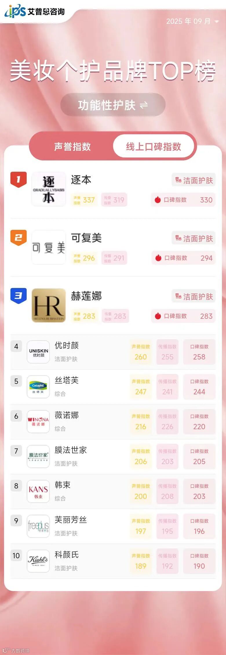 线上口碑指数排名前三的功能性护肤品牌为:逐本*、可复美*、赫莲娜*。