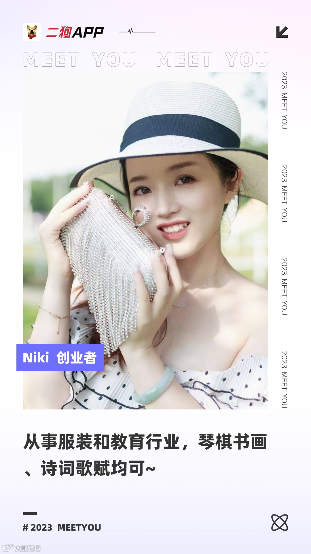 开朗,温柔,声音甜美,爱笑爱聊天(最好语音或者电话聊);从事服装和教育,工作比较自由轻松;能歌善舞,文艺,喜欢旅行,看电影,户外活动等。
