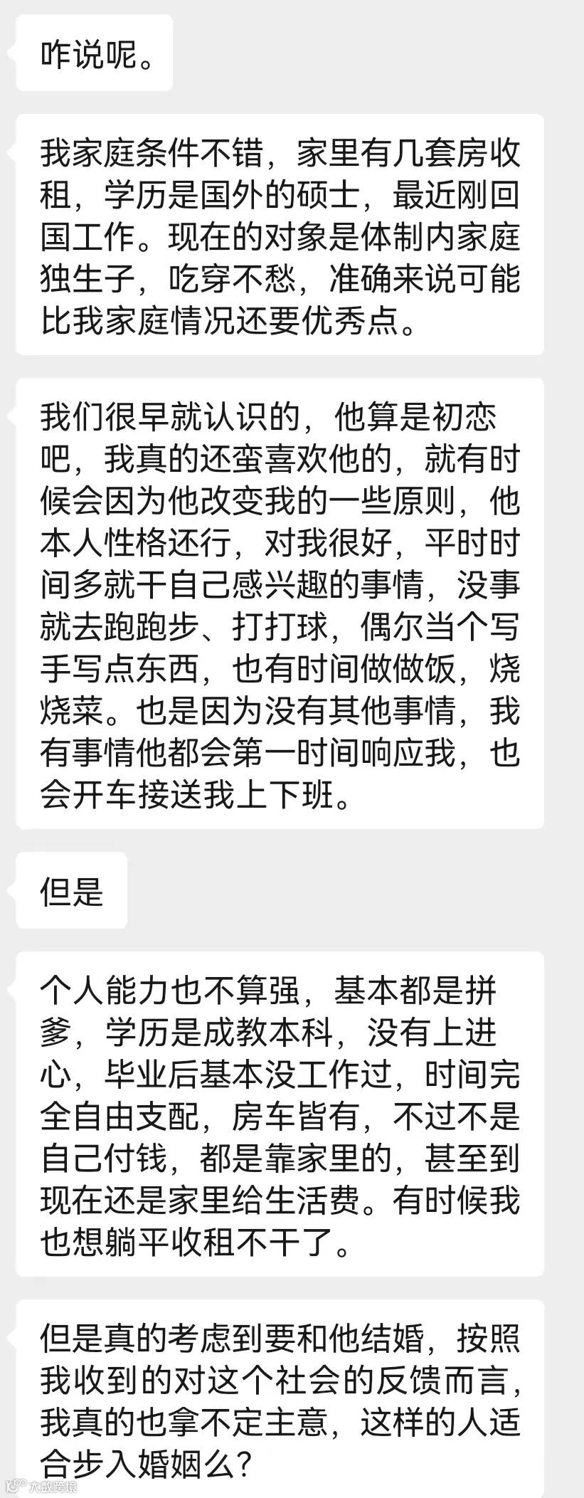 今日话题:这次投稿的女生家境不错,男友家境也优渥,只是男友本身不求上进,甚至有影响自己想法的趋势,但是男友本身没有什么别的问题,对她好,生活也算认真积极,想问问大家这样男友,是否适合结婚?