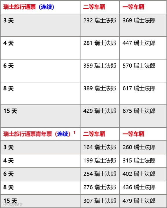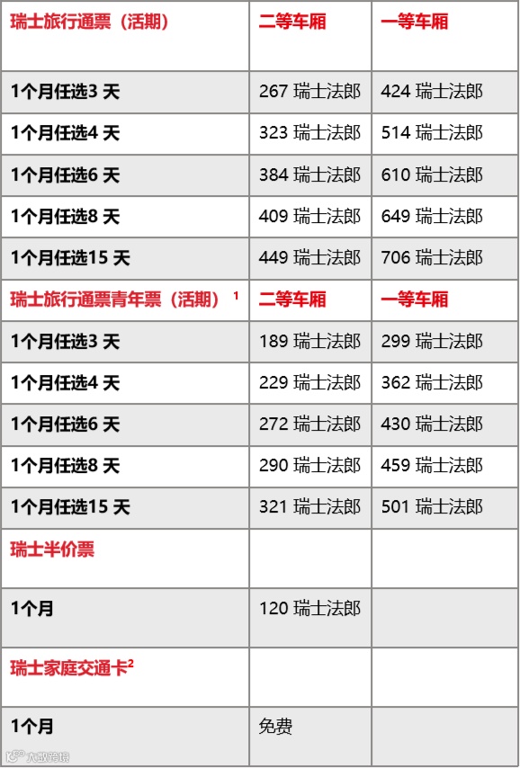 适用范围:与瑞士旅行通票相同。