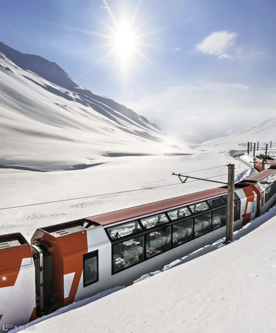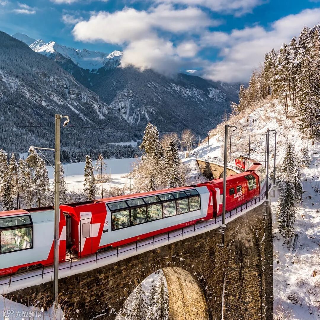*冰川快车——往返于圣莫里茨-采尔马特之间。这是世界上行驶最慢的观景快车,也是你一生中绝对不愿错过的景观列车。冬日的冰川列车穿行在皑皑白雪中,仿佛带你前往纯净的雪国。其行程近8个小时,跨越291座桥梁、穿过91条隧道。