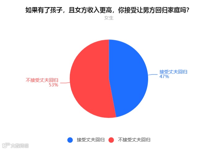 女生中,53%的人表示不能接受丈夫回归家庭,47%的人表示可以接受丈夫回归。
