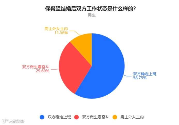 男生中,58.75%的人表示要双方稳定上班,29.69%的人表示双方一起做生意,11.56%的人表示男主外女主内。