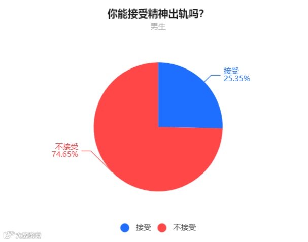 男生中,74.65%的人表示无法接受精神出轨,25.35%的人表示如果维护好家庭,他们可以接受。