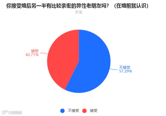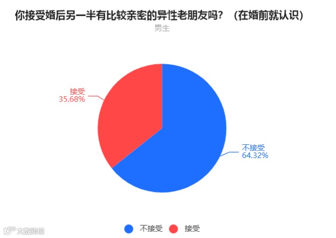 通过投票结果可以看到,有近一半的女生可以接受男生有亲密的异性朋友,而六成以上的男性无法接受自己的老婆有亲密的异性朋友。