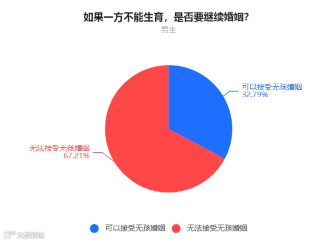 男生中,67.21%的人表示无法接受无孩婚姻,32.79%的人表示可以接受无孩婚姻