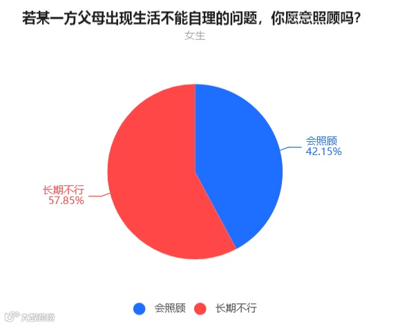 女生中,42.15%的人表示会照顾长辈,57.85%的人表示长期的话没办法照顾。
