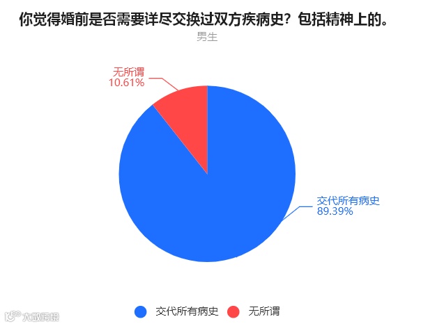 通过投票结果可以看到,女生几乎都需要详尽地了解对方的病史,而男生有1成的人认为无所谓。