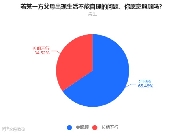 男生中,65.48%的人表示会照顾长辈,34.52%的人表示长期的话没办法照顾。