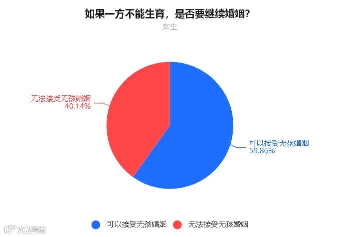 女生中,40.14%的人表示无法接受无孩婚姻,59.86%的人表示可以接受无孩婚姻。