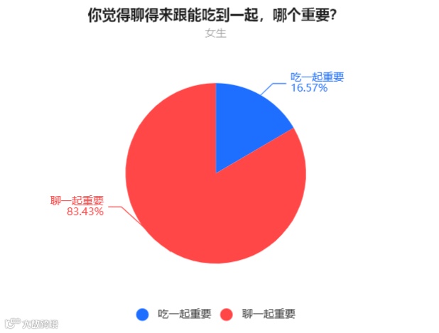 女生中,83.43%的人表示聊在一起比较重要,16.57%的人表示吃在一起比较重要。
