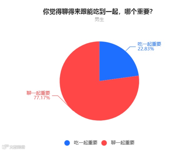 男生中,77.17%的人表示聊在一起比较重要,22.83%的人表示吃在一起比较重要。
