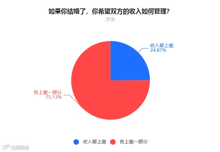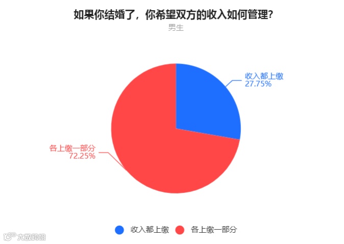 通过投票结果可以看到,无论男女,都希望婚后的收入是上缴一部分,让彼此都有一定的空间。