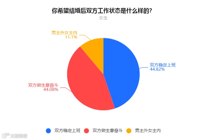女生中,44.82%的人表示要双方稳定上班,44.08%的人表示双方一起做生意,11.1%的人表示要男主外女主内。