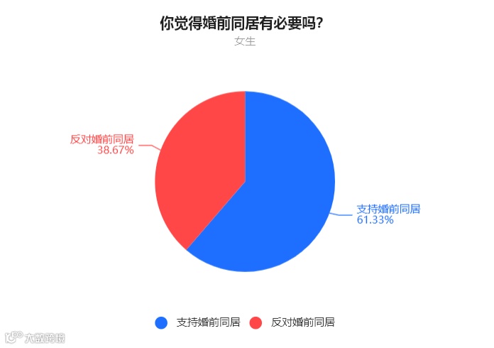 女生中,38.67%的人表示反对婚前同居,61.33%的人表示支持婚前同居。