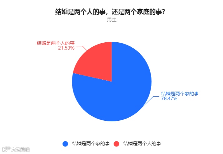 男生中,21.53%的人表示结婚事两个人的事,78.47%的人表示结婚是两个家庭的事。
