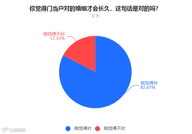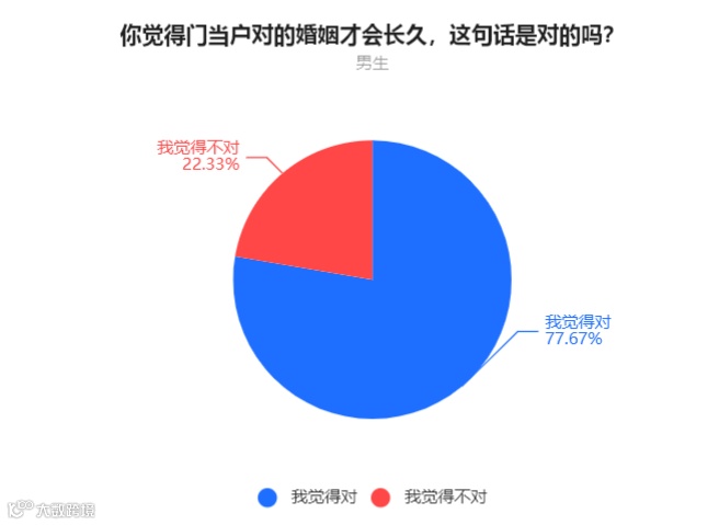 通过投票结果可以看到,大部分的男生女生都认为,门当户对很重要,只有一二成的人认为,这句话不正确。