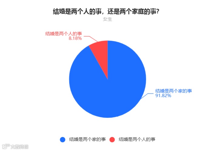 女生中,8.18%的人表示结婚是两个人的事,91.82%的人表示结婚是两个家庭的事。