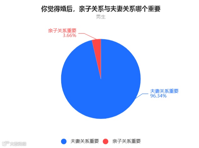 男生中,96.35%的人表示夫妻关系更重要,3.66%的人表示亲子关系更重要。