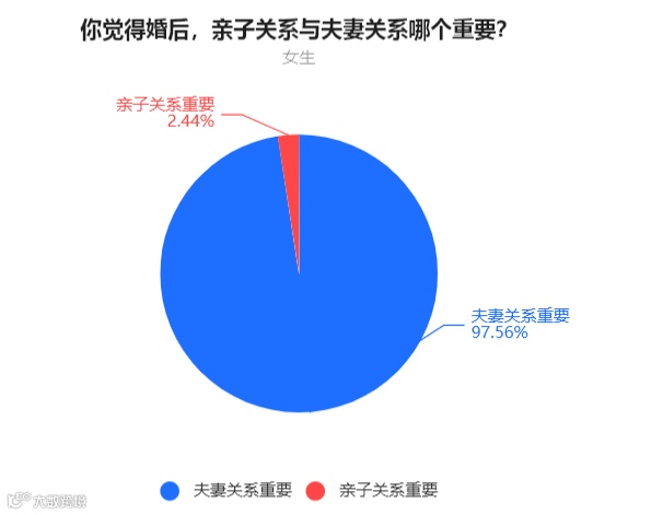 女生中,97.56%的人表示夫妻关系更重要,2.44%的人表示亲子关系更重要。