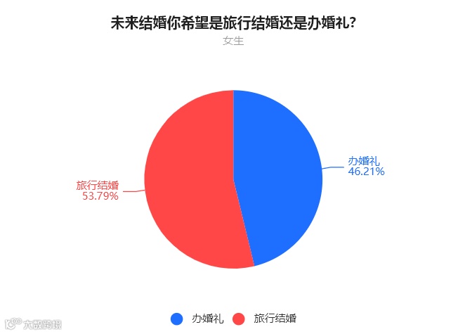 女生中,53.79%的人表示希望旅行结婚,46.21%的人表示希望办婚礼。