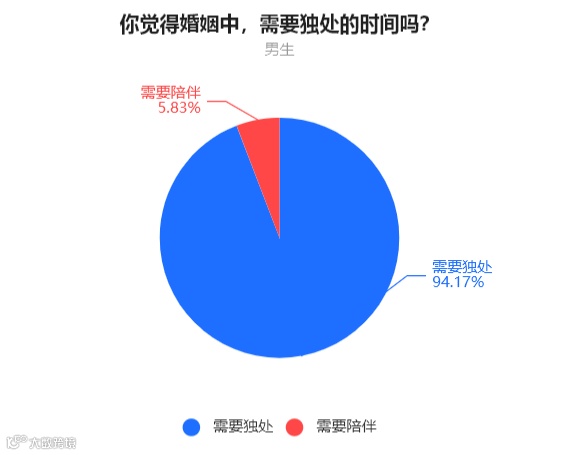 男生中,94.17%的人表示要独处的时间,5.83%的人表示只需要陪伴不需要独处