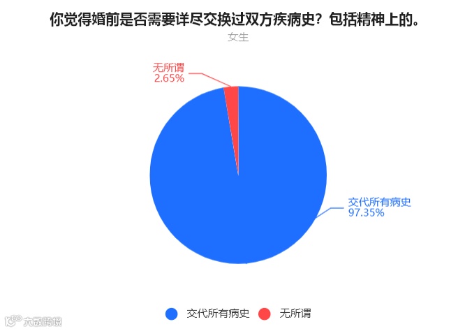 女生中,97.35%的人表示一定要详尽交换双方的病史,2.65%的人表示无所谓。