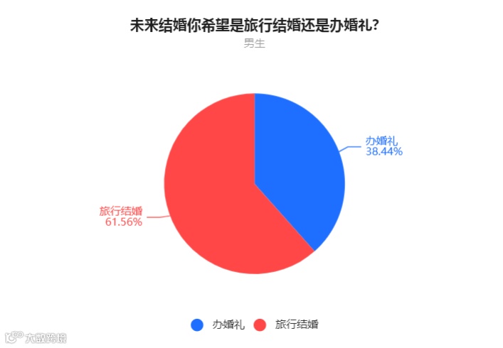 男生中,61.56%的人表示希望旅行结婚,38.44%的人表示希望办婚礼。