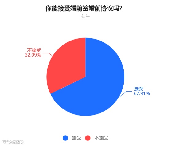 女生中,67.91%的人表示可以接受签署婚前协议,32.09%的人表示无法接受签署婚前协议。