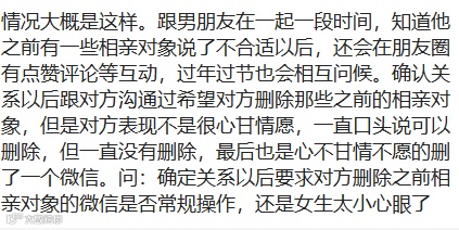 来自一个女生投稿:男生和女生在一起后,偶尔还会跟之前相亲对象在朋友圈点赞评论互动,过节相互问候。女生要求男生将之前的相亲对象微信删除,男生只是不情愿的删掉了一个。