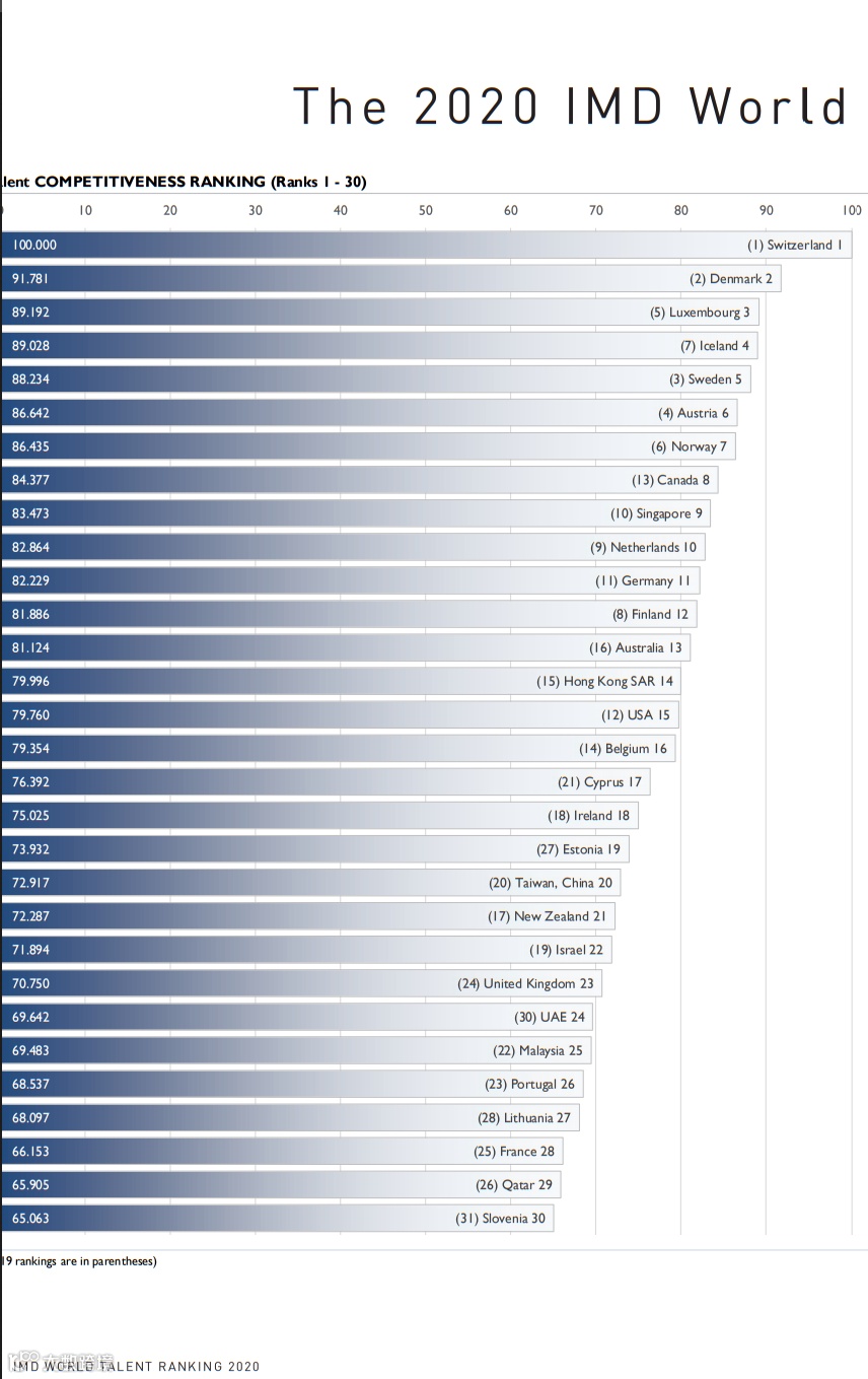 导读:瑞士被认为是世界上“最具聪明智慧国家”,根据《IMD全球人才排行 2020》最新报告表明,瑞士已连续第五年排