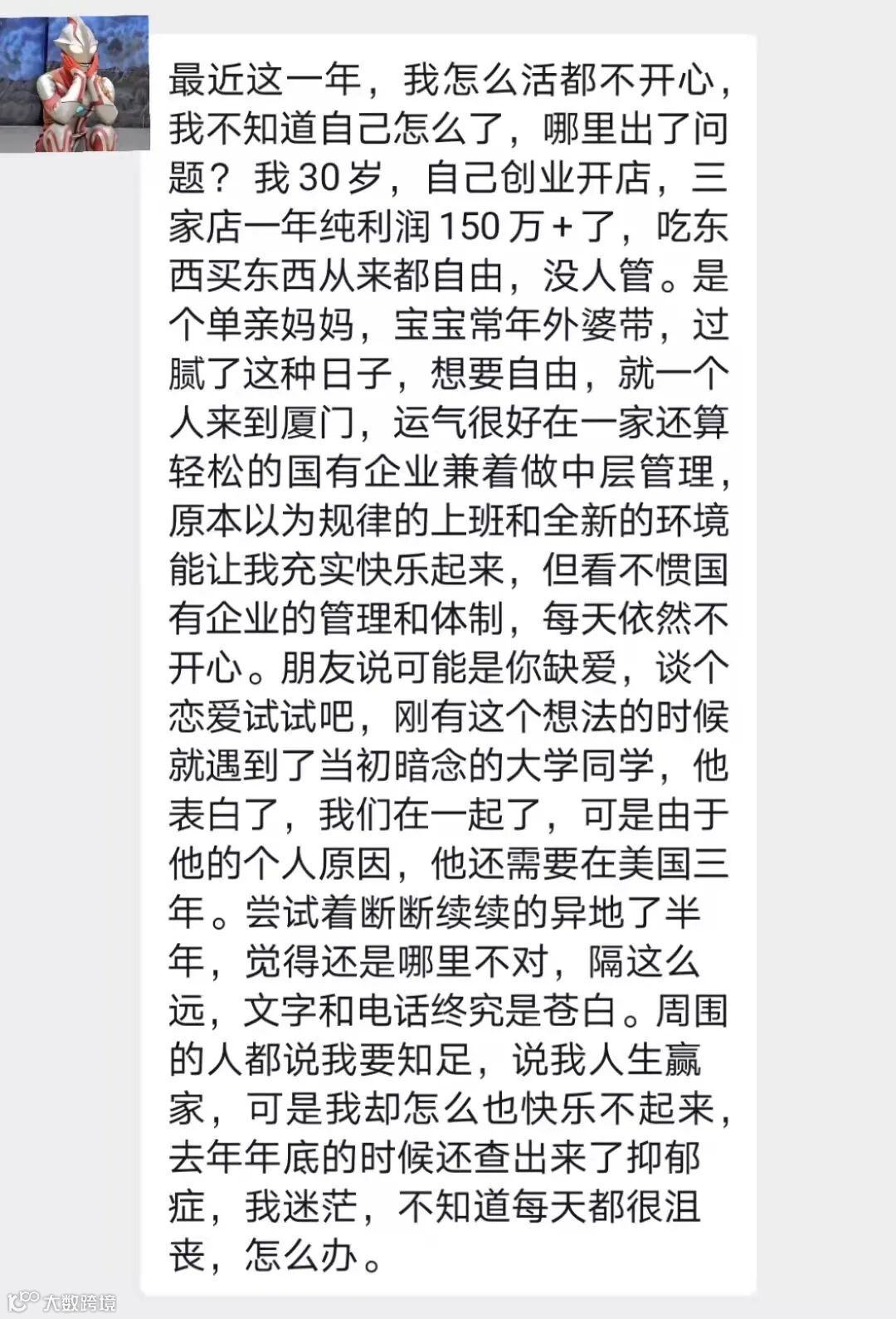 投稿:我是单亲妈妈,创业开店纯利润150w+,已经实现财务自由,可是怎么也活得不开心,每天都很沮丧,我该怎么办?
