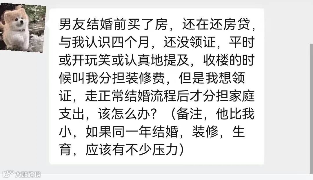 投稿:男友结婚前买了房,还在还房贷,与我认识四个月,还没领证,平时或开玩笑或认真地提及,收楼的时候叫我分担装修费,但是我想领证,走正常结婚流程后才分担家庭支出,该怎么办?(备注,他比我小,如果同一年结婚,装修,生育,应该有不少压力)