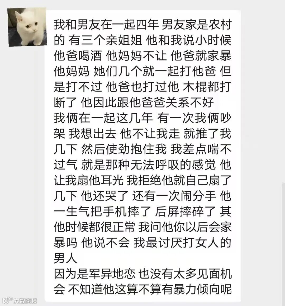 投稿:男朋友家是农村的,三个姐姐,他爸爸酗酒家暴,和他是军异地恋四年,见面机会没有很多。吵架的时候他推了我几下,还扇他自己耳光,摔手机。我问他以后会家暴吗,他说不会,最讨厌打女人的男人。不知道他这算不算有暴力倾向?