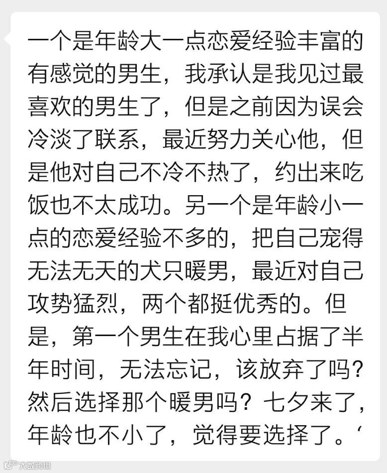 两个男生都挺优秀的,但前者在她心中占据了半年难以忘怀,而她因年龄不小、七夕将近急于选择,该放弃前者选择追求她的后者吗?