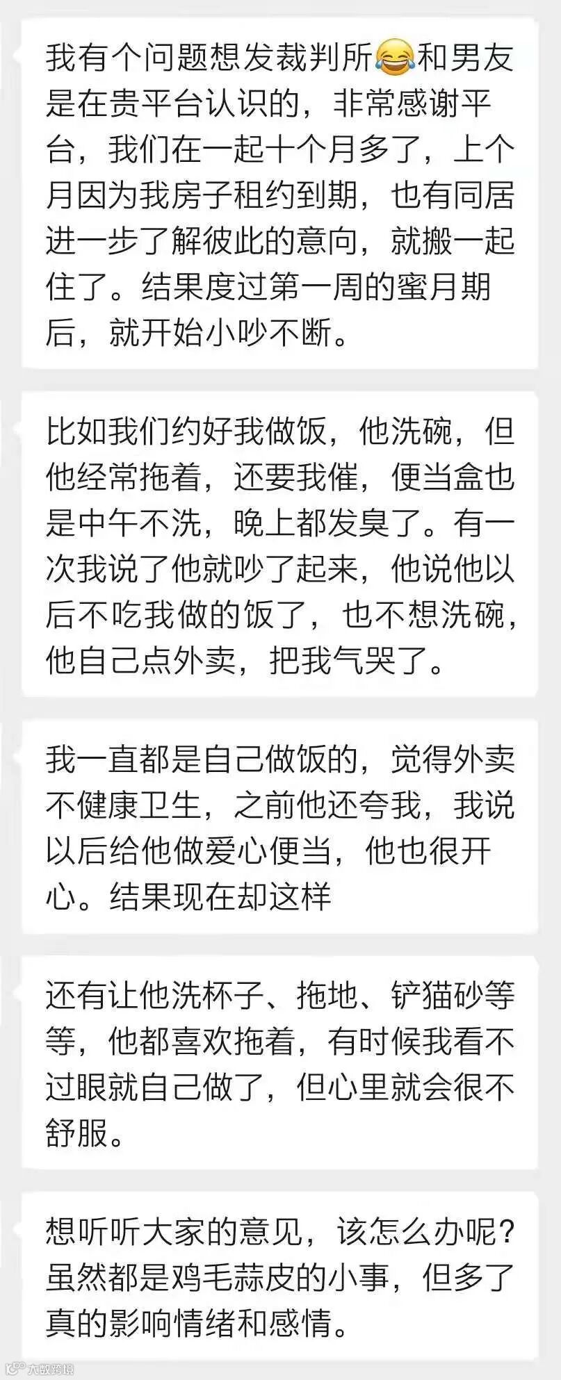 一位女生投稿说,她和男友上个月刚开始同居生活,但只过了一周“蜜月时光”,就开始小吵不断。