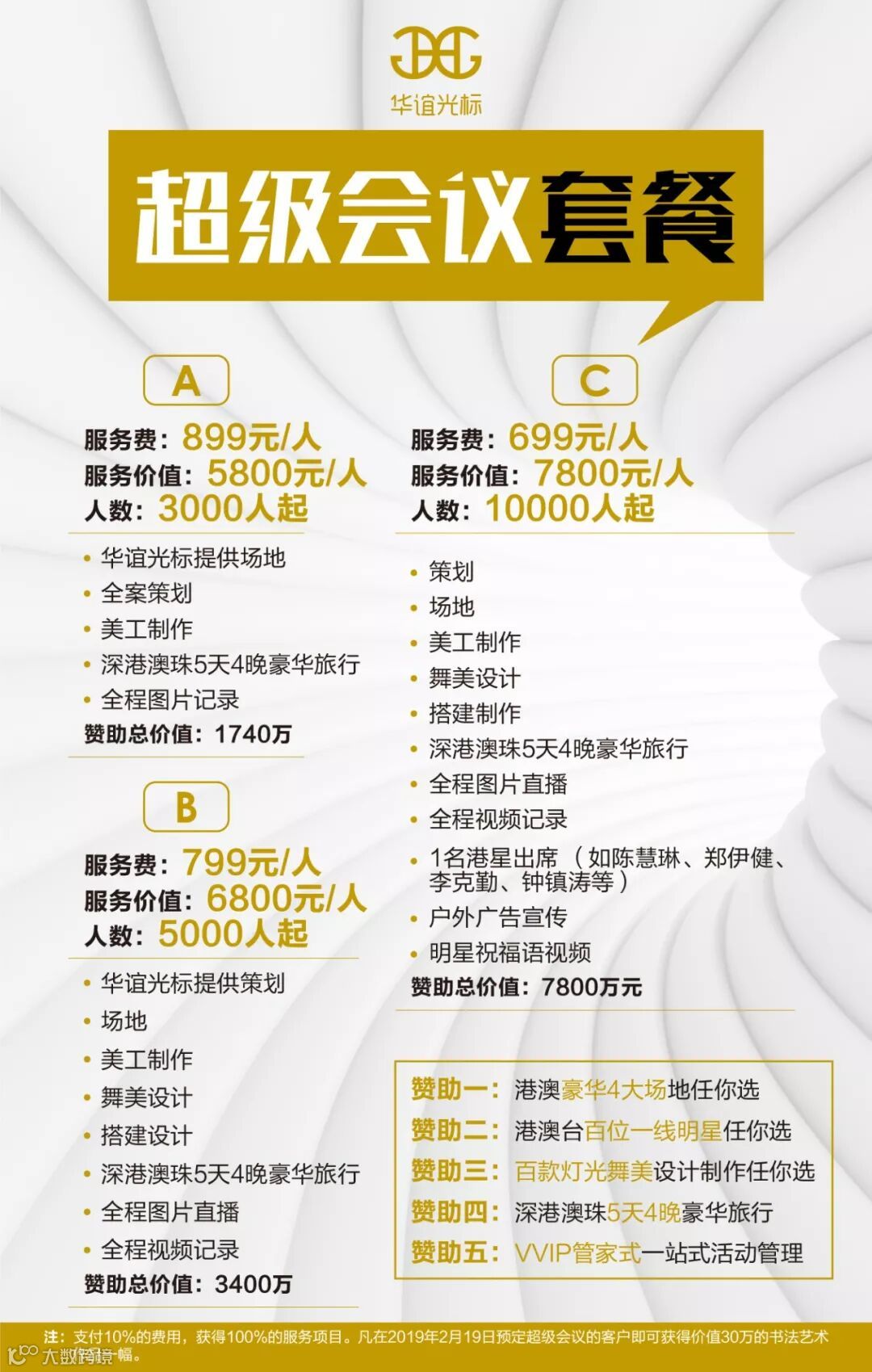 华谊光标从事会议活动策划10年有余,现在我们推出会议+旅行+音乐会模式. 摆脱烦躁的传统会议感受,与活动目的地联合赞助补贴会议基本费用,同时邀约明星出席提高会议规格. 让主办方有效节约会议成本65%以上,让参会者感受丰富的会议内容,达成完美的体验效果.