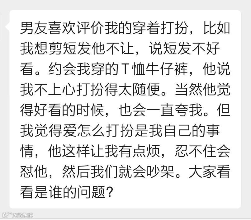 一位女生投稿说,男友喜欢评价她的穿着打扮,比如不让她剪短发、约会时希望她精心打扮。但女生觉得怎么打扮是她自己的事情,男友的干涉让她觉得很烦,两人会因此吵架。