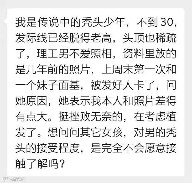 一位男生投稿说,他是传说中的“秃头少年”,不到30岁,发际线已经很高,头顶也稀疏了。平时不爱拍照,资料里放的是几年前的照片。