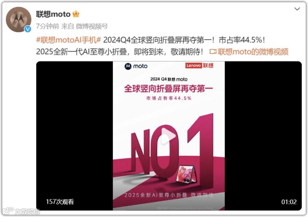 3月19日,调研机构IDC放出了2024年Q4的手机市场数据,小折叠屏赛道,联想moto以44.5%的市场占有率又双叒叕拿下全球竖向折叠屏第一。
