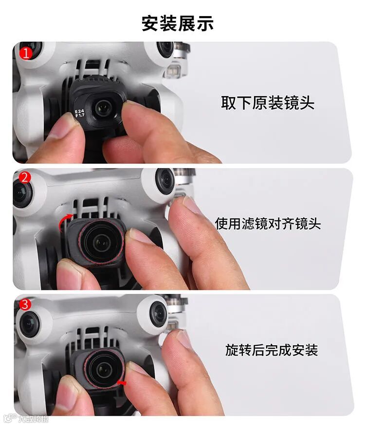 取下原装镜头 使用滤镜对齐镜头 旋转后完成安装