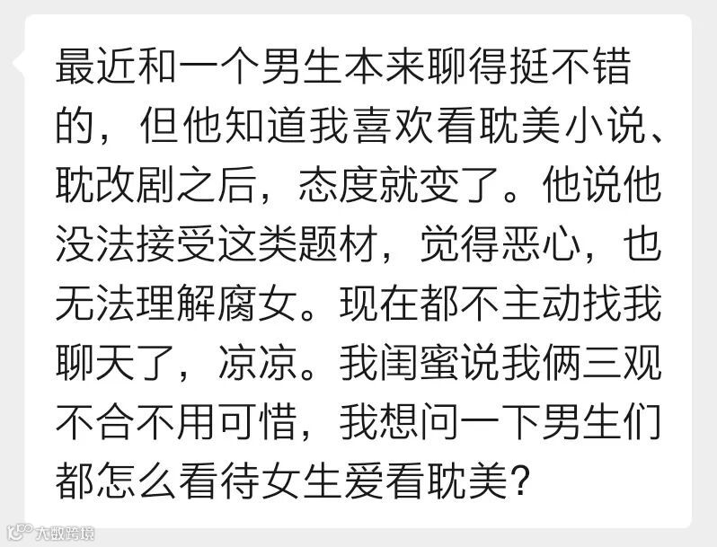 一位女生投稿说,她原本和一个男生聊得挺不错的,但他知道她喜欢看耽美后就不再主动找她聊天了。男生说他觉得耽美题材恶心,无法接受,也无法理解“腐女”。